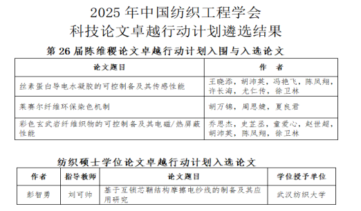 学会还发布了中国纺织工程学会科技论文卓越行动计划遴选结果:《条混过程模拟及纤维在纱条中分布的预测》等8篇博士学位论文入选纺织博士学位论文卓越行动计划;《基于细观统计特征的3D-BFRP参数化随机建模与力学性能验证》等12篇硕士学位论文入选纺织硕士学位论文卓越行动计划;《光致变色纺织品的制备及其防伪应用》等30篇论文入围第26届陈维稷论文卓越行动计划,其中《莱赛尔纤维环保染色机制》等15篇为入选论文。
