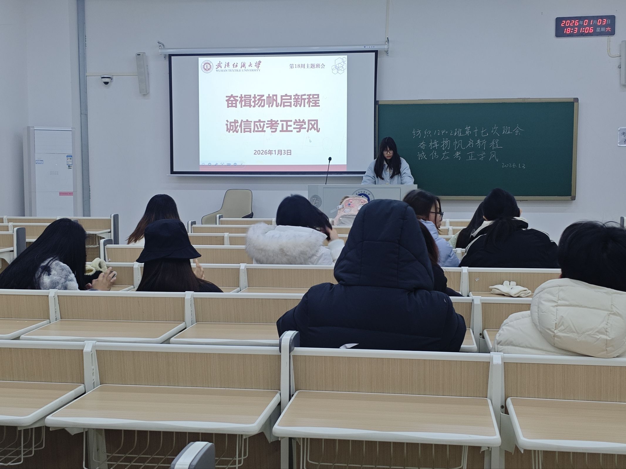 为引导学生明确奋斗目标、筑牢思想根基、营造优良学风,1月3日,纺织学院组织开展“奋楫扬帆启新程 诚信应考正学风”主题班会。班会由各年级辅导员、班主任主持,全体本科生共同参与。